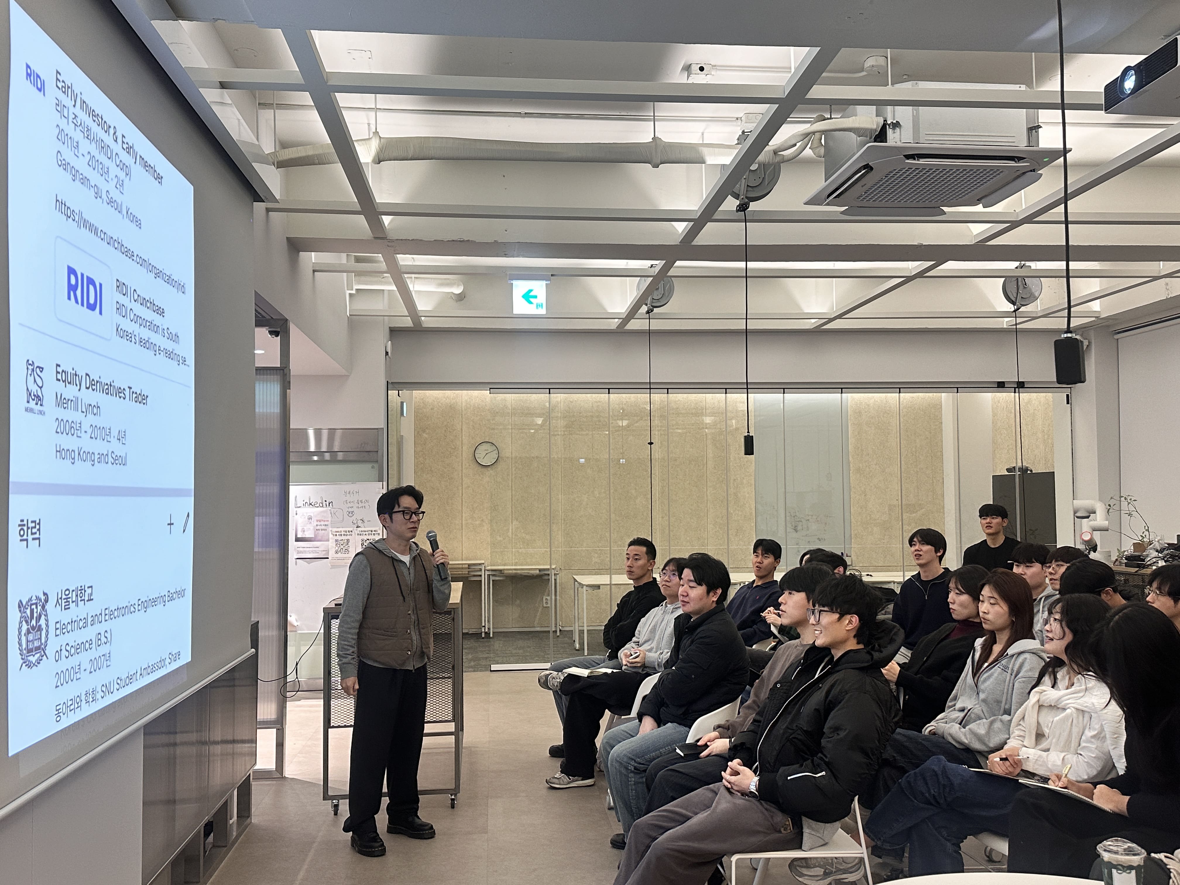 : 선배 창업가들을 초청해 강연을 듣고 자유롭게 대화 및 토론하며 인사이트를 얻는 세션